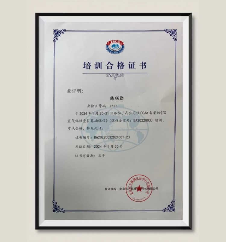 陈联勤:荣获《温室气体核查员基础课程》培训合格证书