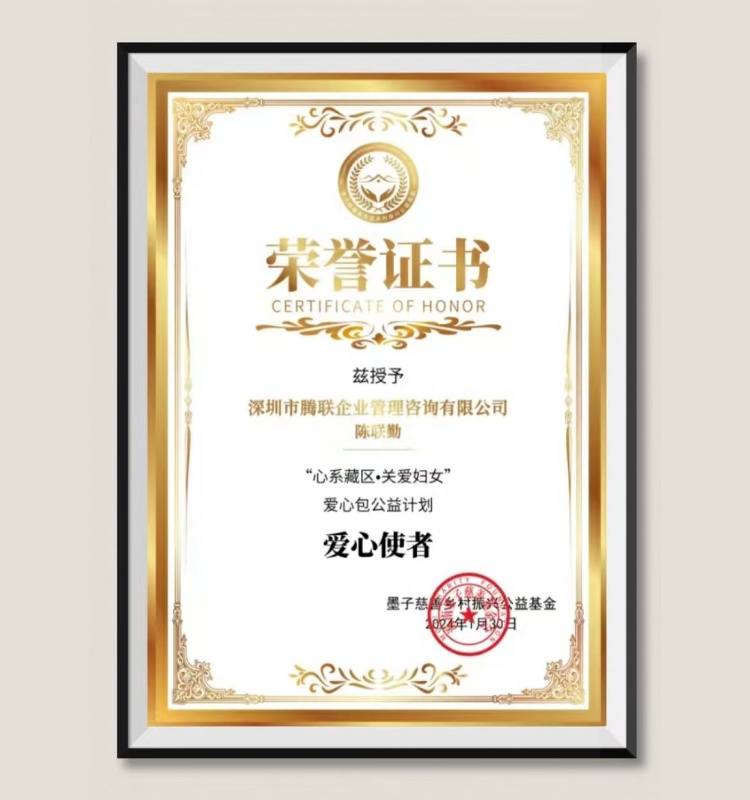 陈联勤:兹授予深圳市腾联企业管理咨询有限公司陈联勤,爱心使者荣誉证书