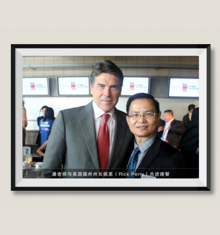 潘伟成:潘伟成老师(右)与美国德州州长佩里(Rick Perry)共进晚餐