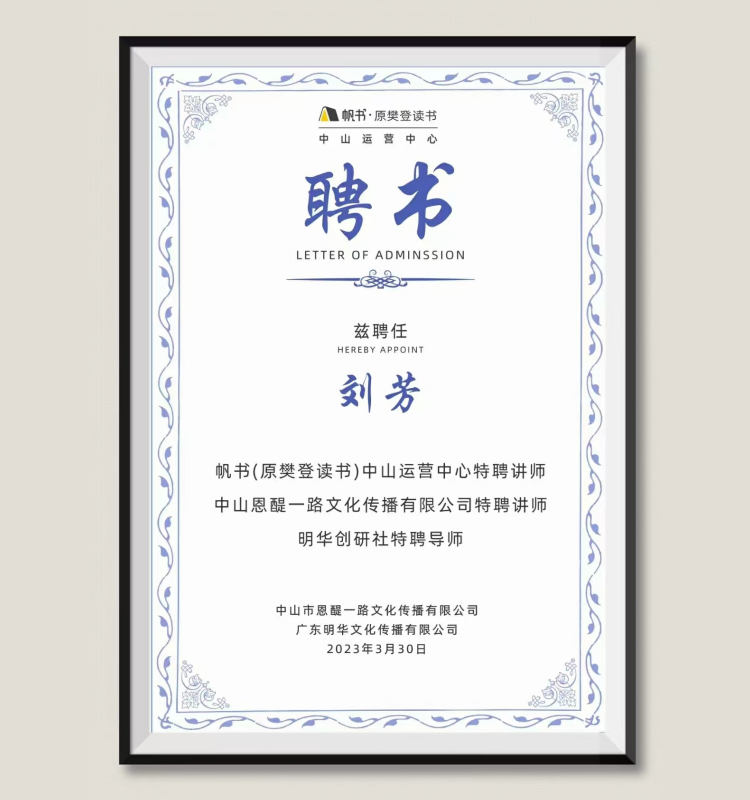 刘芳:受聘为“帆书(原樊登读书)中山运营中心特聘讲师;中山恩醍一路文化传播有限公司特聘讲师;明华创研社特聘导师