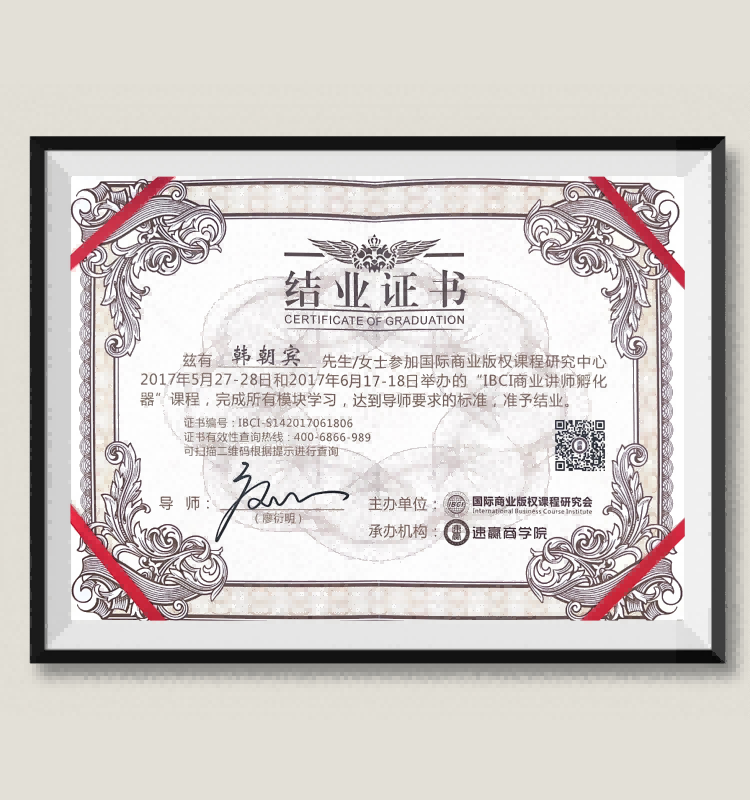 韩朝宾:荣获“IBCI商业讲师孵化器”课程结业证书