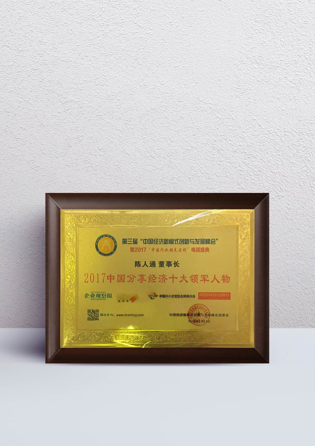 陈人通:“2017中国分享经济十大领军人物”证书
