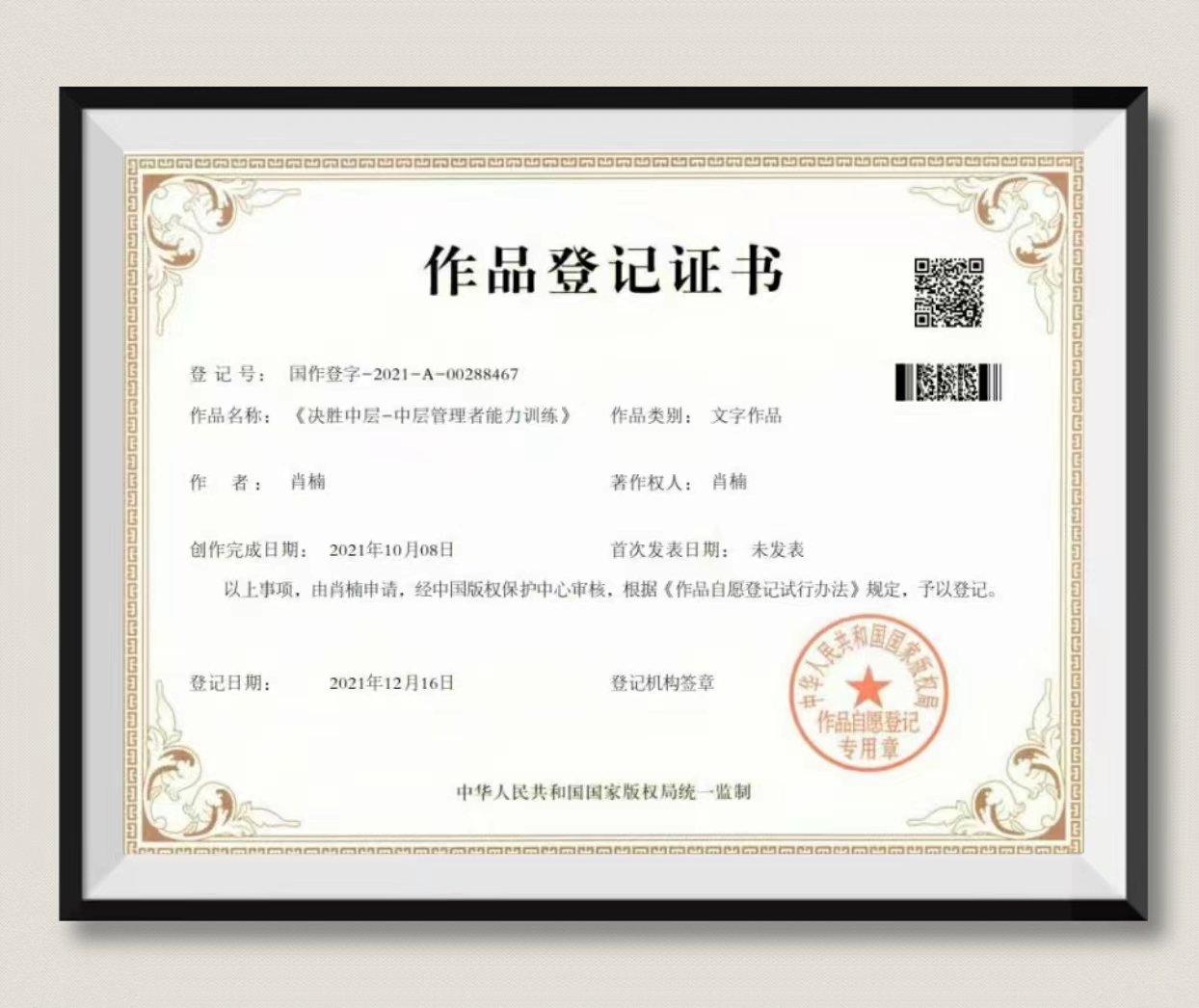肖楠:《决胜中层-中层管理者能力训练》作品登记证书