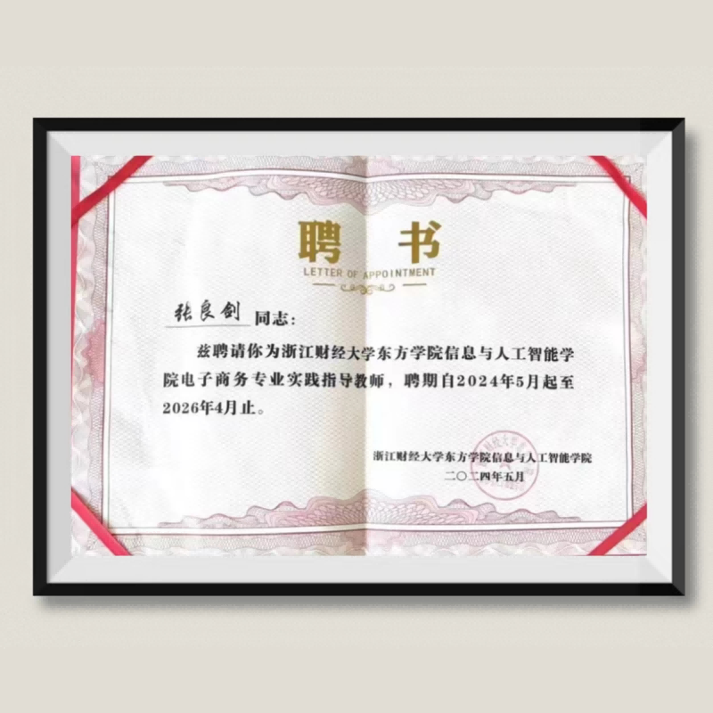 张良剑:受聘为——浙江财经大学东方学院信息与人工智能学院电子商务专业实践指导教师