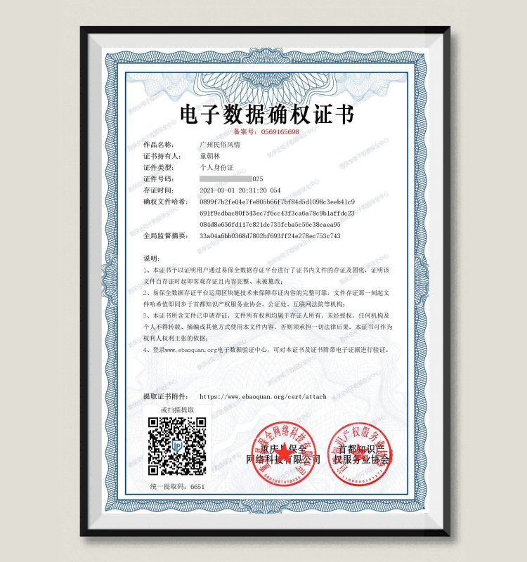 童朝林:广州民俗风情确权证书
