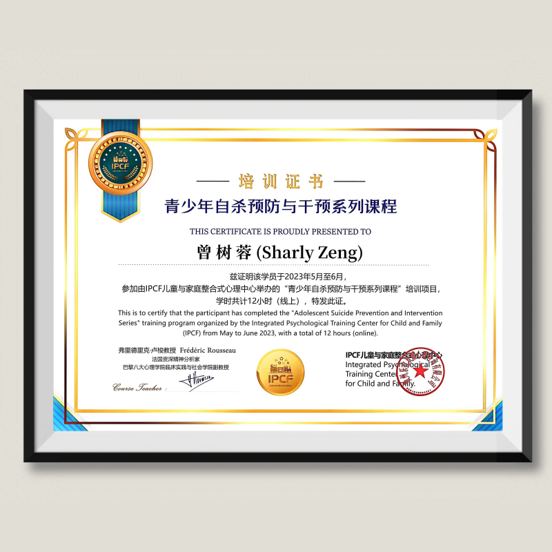 曾树蓉:荣获青少年自杀预防与干预系列课程培训证书