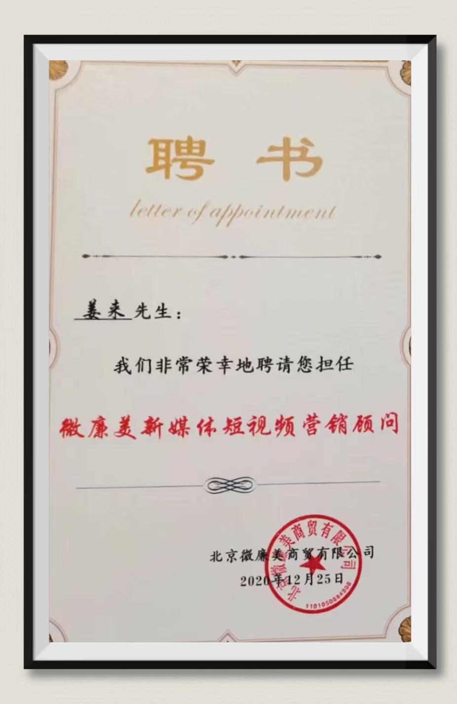 姜来:受聘为“威廉美新媒体短视频营销顾问”