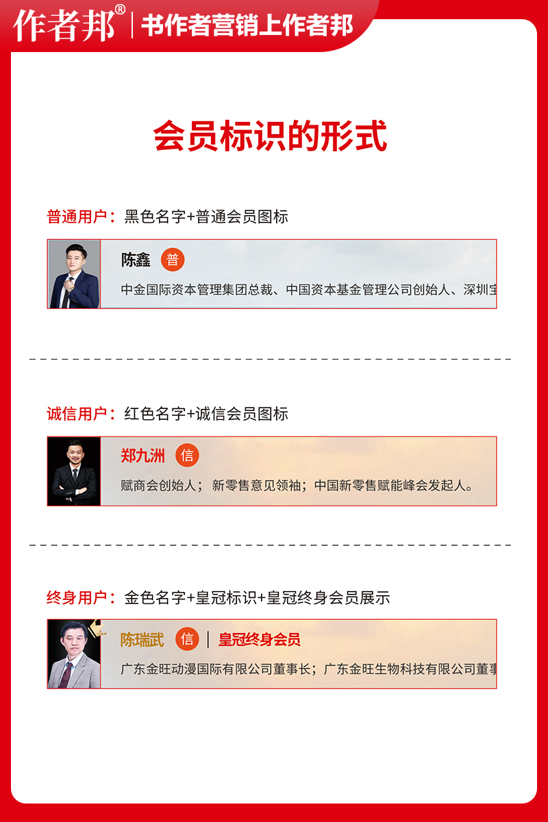 什么是会员 尊贵独享网站多种功能,多种经纪人服务、营销服务的特权用户。 会员标识的作用 作者邦提供的可供专属会员,辨认不同作者的标识。会员标识不同,代表享受服务、特权不同。在作者列表中脱颖而出,展示会员书作者独特身份地位,彰显尊贵身份。会员等级不同,代表信用积累程度不同,等级越高,代表享受特权服务越多,网站积累信息更全面,质量更高。