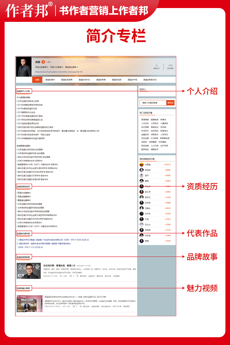 什么是作者简介 作者邦为书作者提供一个个人履历的栏目,且展示于整个互联网,公开透明,是书作者的个人黄金履历,以及金字招牌。 作者简介的作用 代表个人资质经历经得起考验与质疑,信息真实有效。彰显作者自身的个人品牌实力与行业影响力,突出作者优势,体现作者能力,并且被百度、360、搜狗、谷歌等各大搜索引擎平台收录。