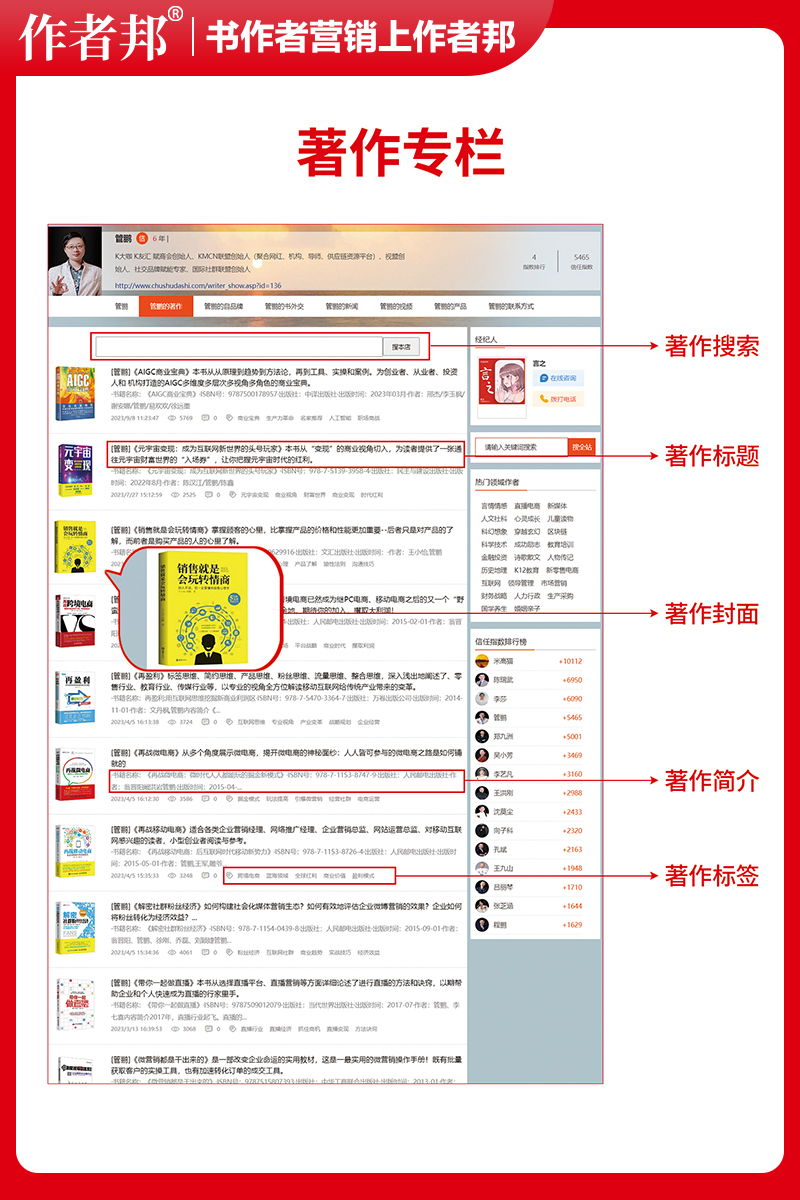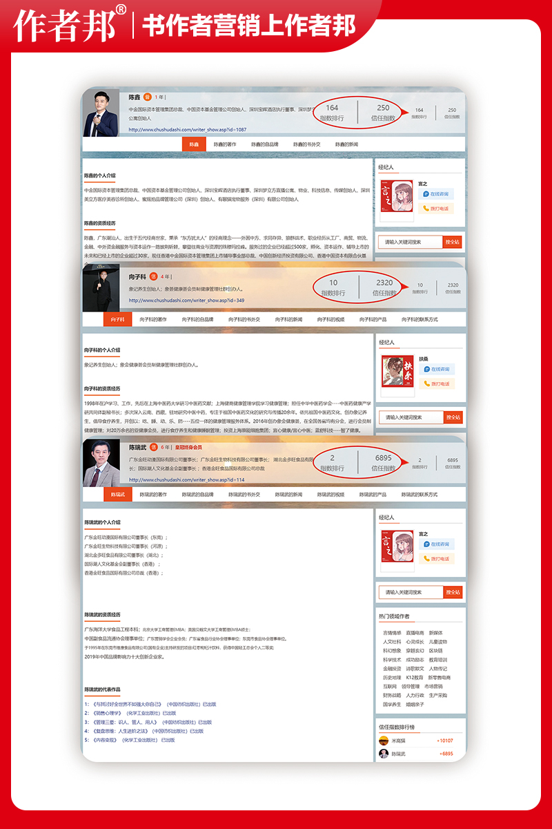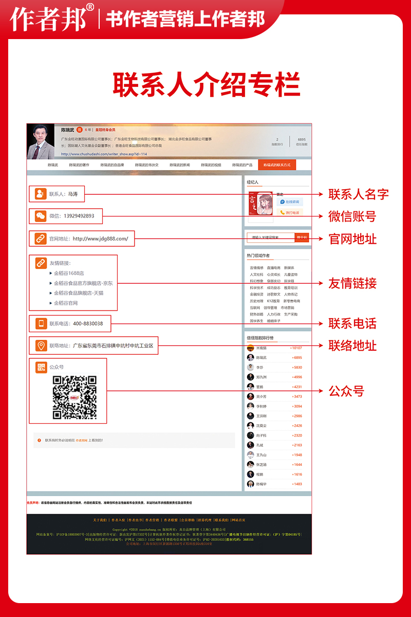 可通过作者邦全职经纪人或书作者自己及团队,将书作者信息,采集、整理、上传、累积到作者个人网站上,形成品牌传播,和个人、品牌、企业软实力打造,并随着时间的积累,形成数据资产以及数字信用。