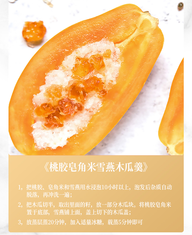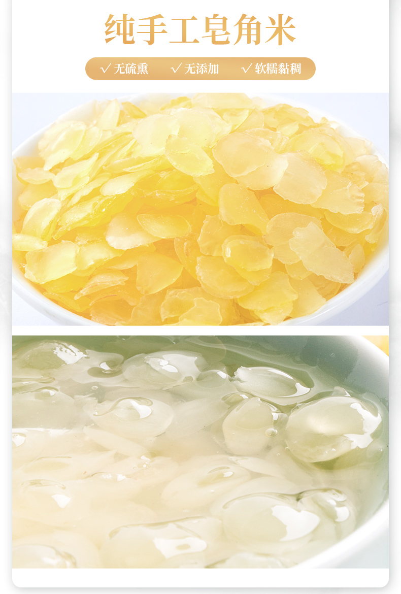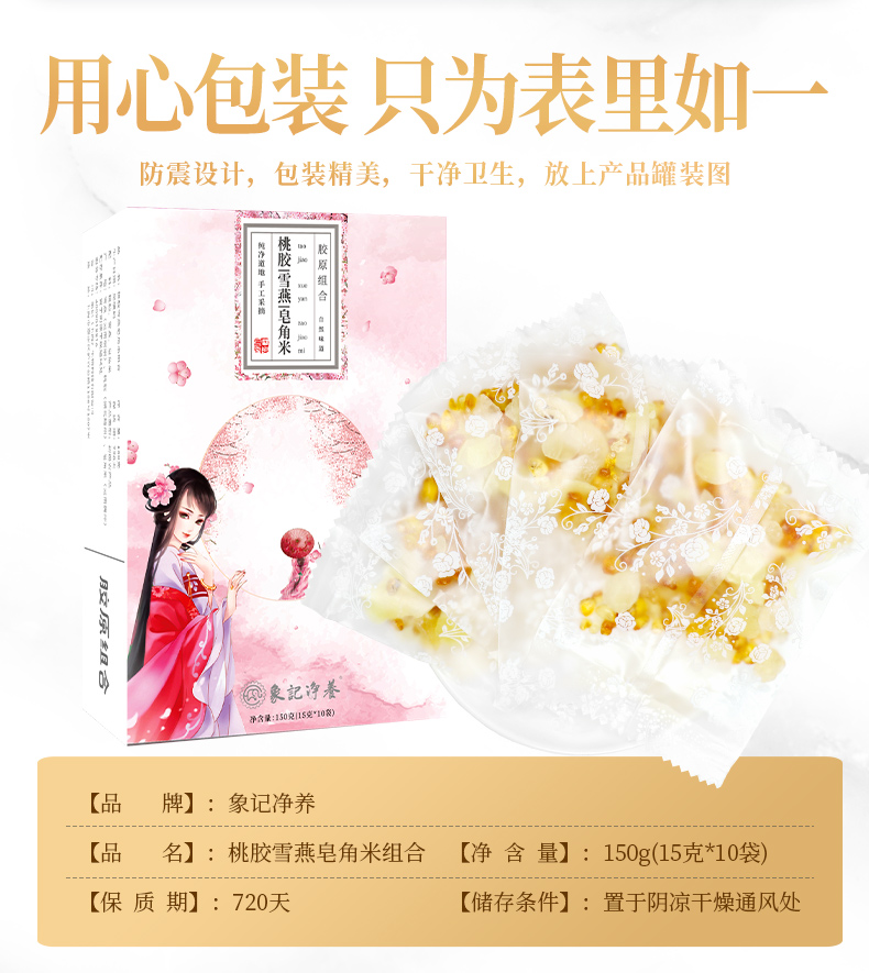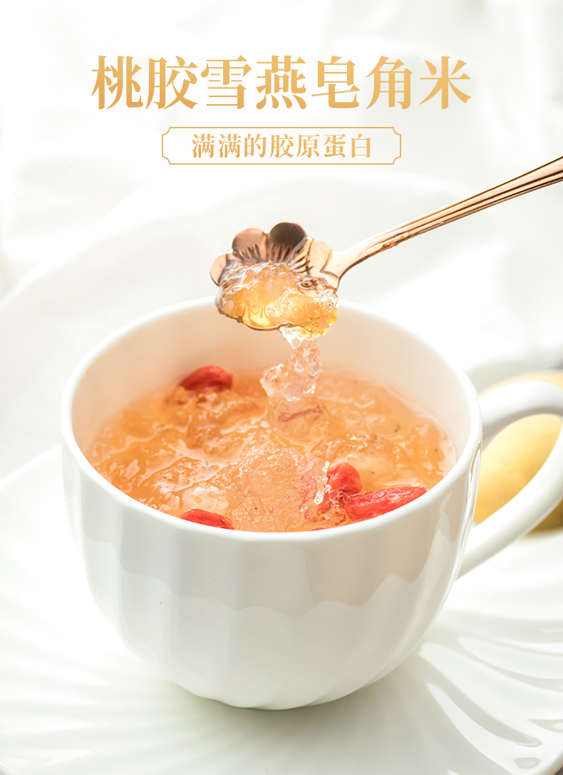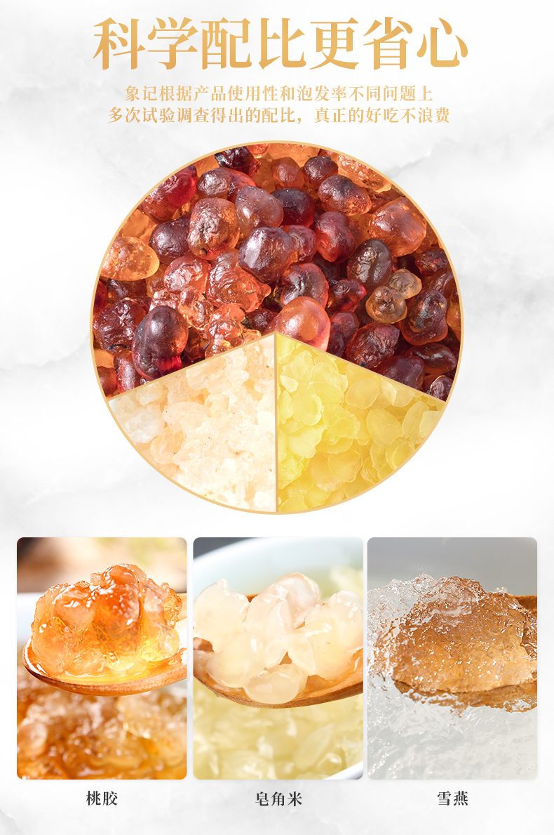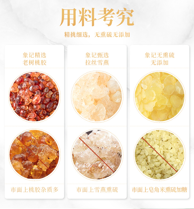 精选云南的优质桃胶、雪燕和皂角米,每一颗都蕴含着大自然的精华,桃胶、雪燕、皂角米3:1:1黄金比例精心调配,科学配比,营养均衡,不仅丰富了口感,增强美容效果让你由内而外散发自然光彩。