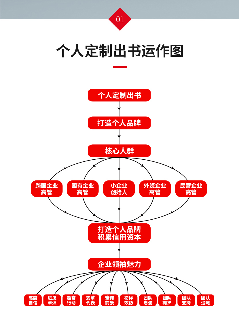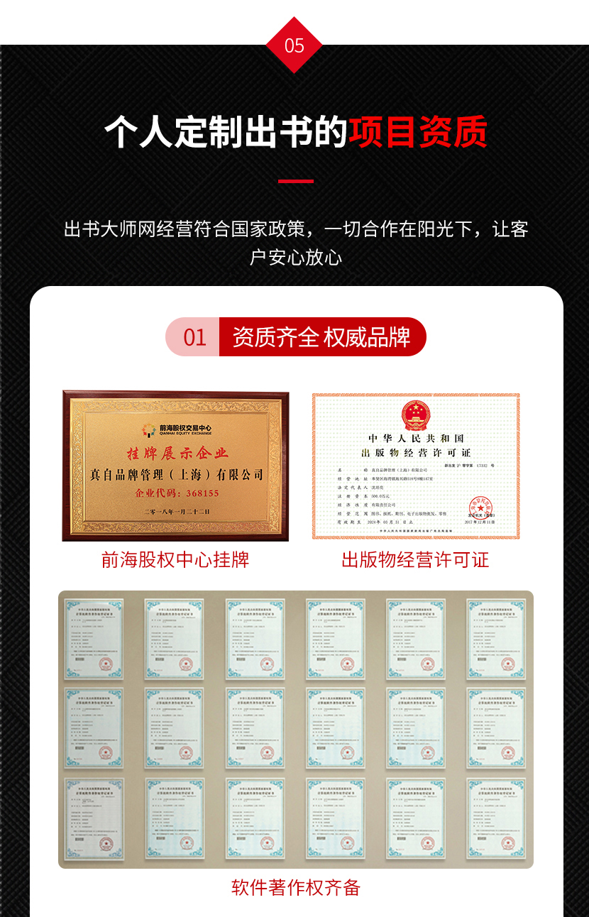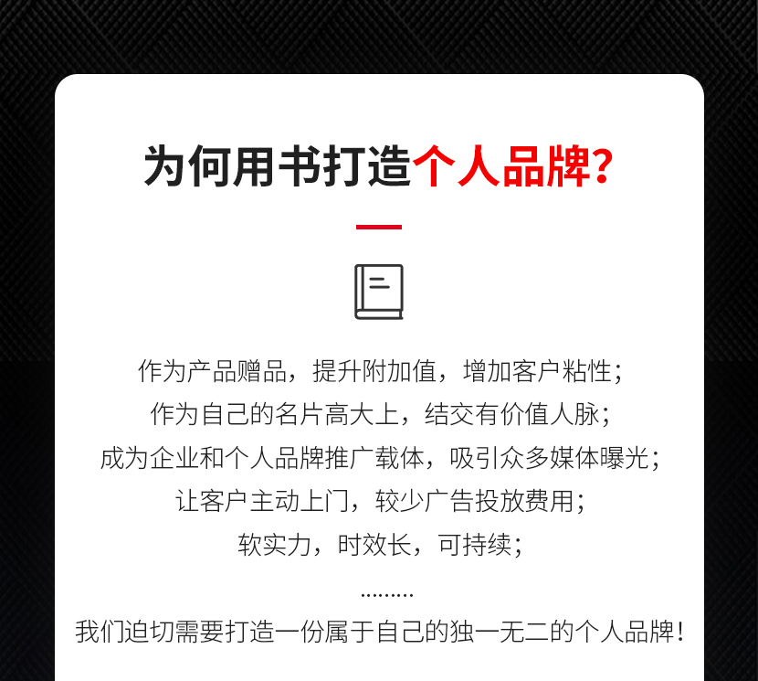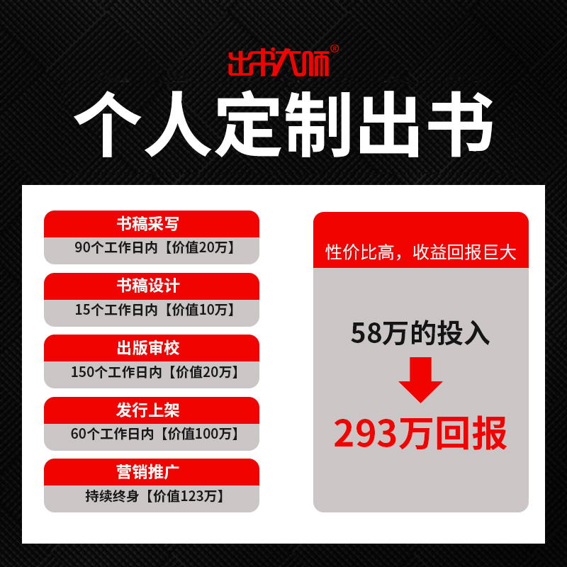出书大师个人定制出书,通过专业作家对个人经历进行梳理,创作独一无二的属于您的个人品牌IP著作,是目前出书大师最直接最有效、塑造品牌正面形象的出书方式。