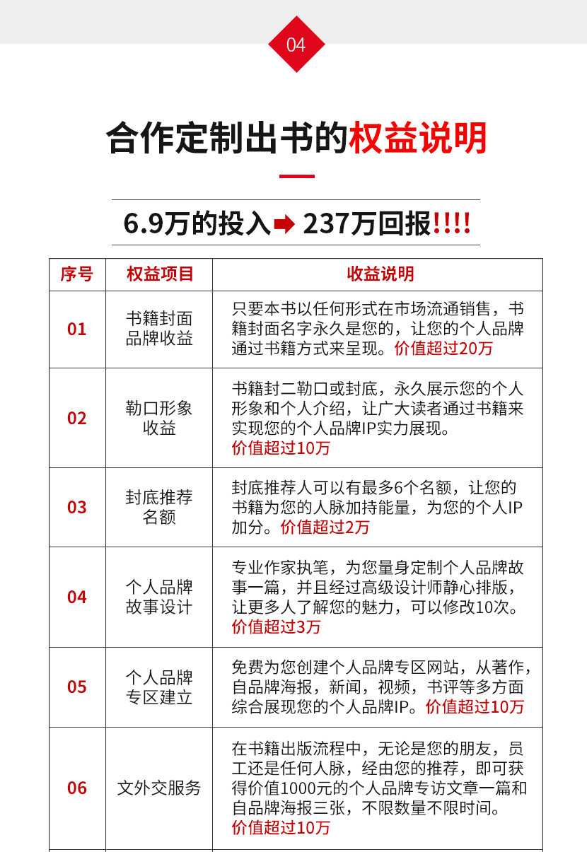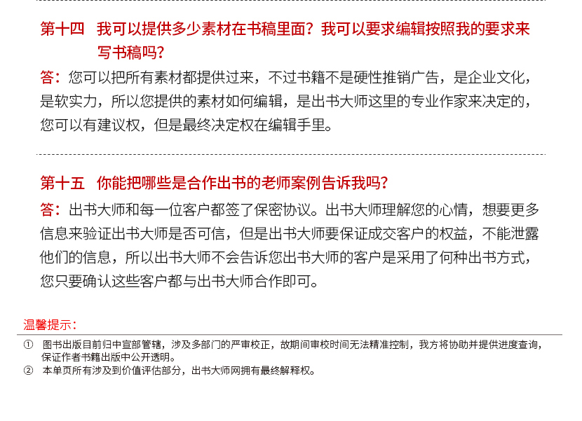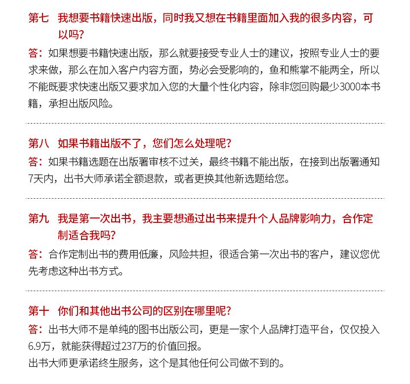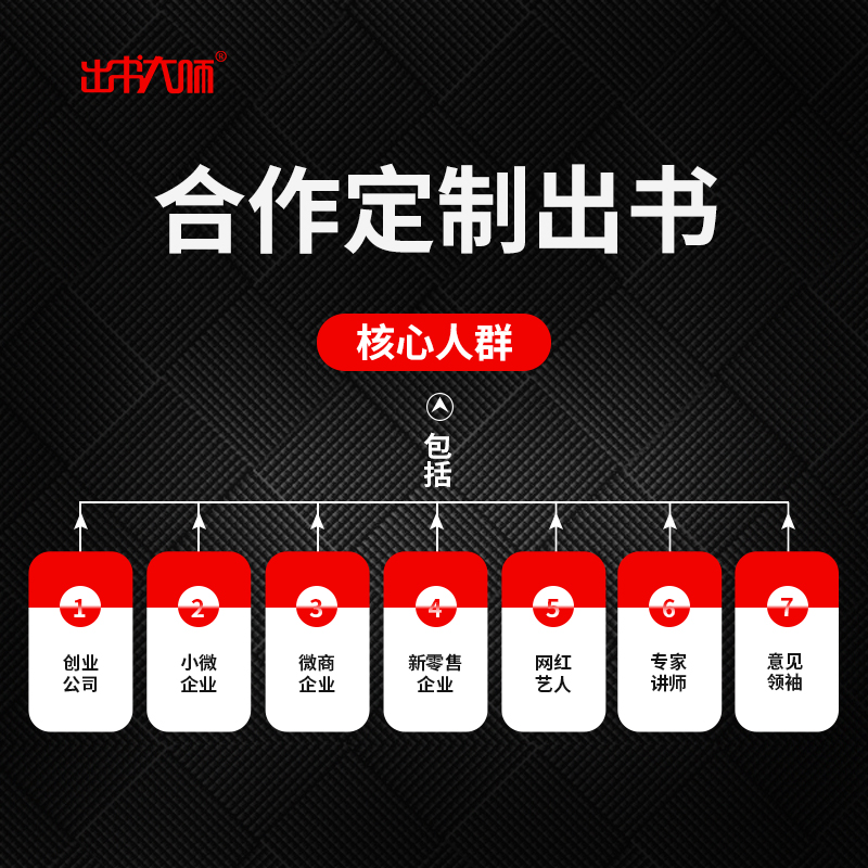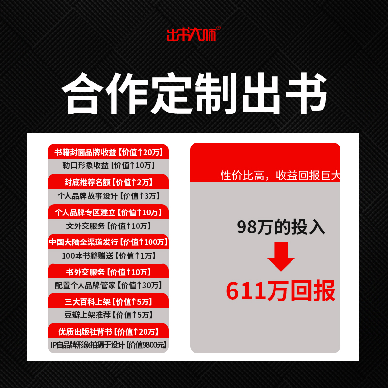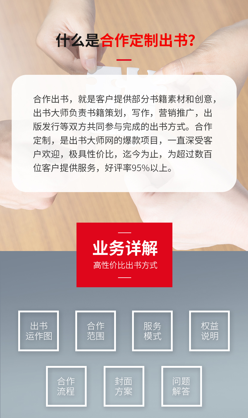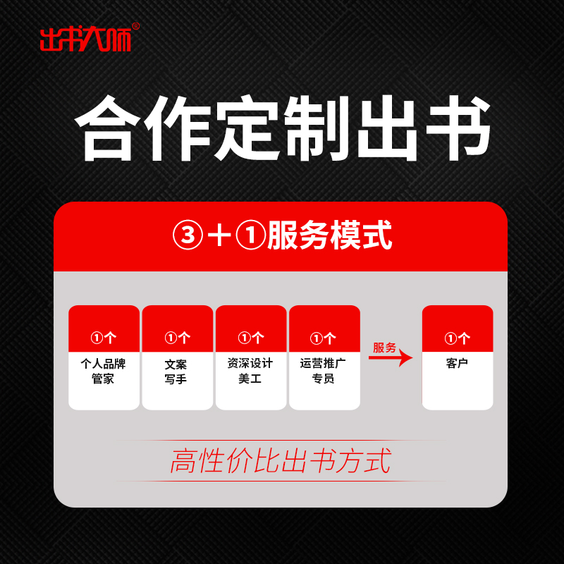 合作出书,就是客户提供部分书籍素材和创意,出书大师负责书籍策划、写作、营销推广、出版发行等双方共同参与完成的出书方式,是出书大师网的爆款项目,一直深受客户欢迎。