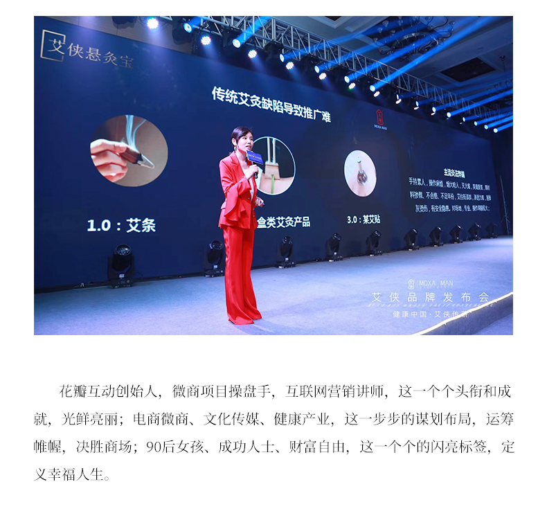 艾侠品牌联合创始人;艾侠传蕲商学院院长; 艾侠灸灸宝品牌联合创始人;深圳花瓣互动创始人; 微商操盘手;微营销讲师;中医健康讲师;