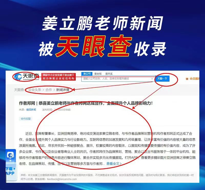 近日,作者邦网为书作者姜立鹏老师撰写的品牌策划文章于各大平台进行推广宣传,短时间内便迅速被百度、天眼查等权威媒介所收录。有效地提升了作者邦网与书作者的知名度与影响力等,并共同创造了有利的多方共赢局面。