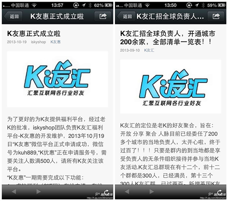 大会还震撼宣布成立全球K友汇微信联盟,每个地方都开通了以kuh打头的当地微信公众号,通过皮皮精灵自媒体运营平台进行运营和推广,联盟设立盟主为掌上青岛的平艺,顾问包括地方微信运营专家窦明亮和wemedia创始人青龙老贼,大家都表示将会用心做好当地的微信公众号。K友汇的官方的微信公众号已经有超过5000的K友订阅,后期也将全力助力各地的微信公众号的推广。各地将会通过当地的微信公众号发布福利、活动、打折会员卡等方面内容,让当地的K友们更好的了解K友汇、参与K友汇,从K友汇的当地活动中分享快乐。目前各地K友汇的微信公众号已经在陆续建立,届时官方也将公布所有确认过的名单,请K友们积极关注和支持。