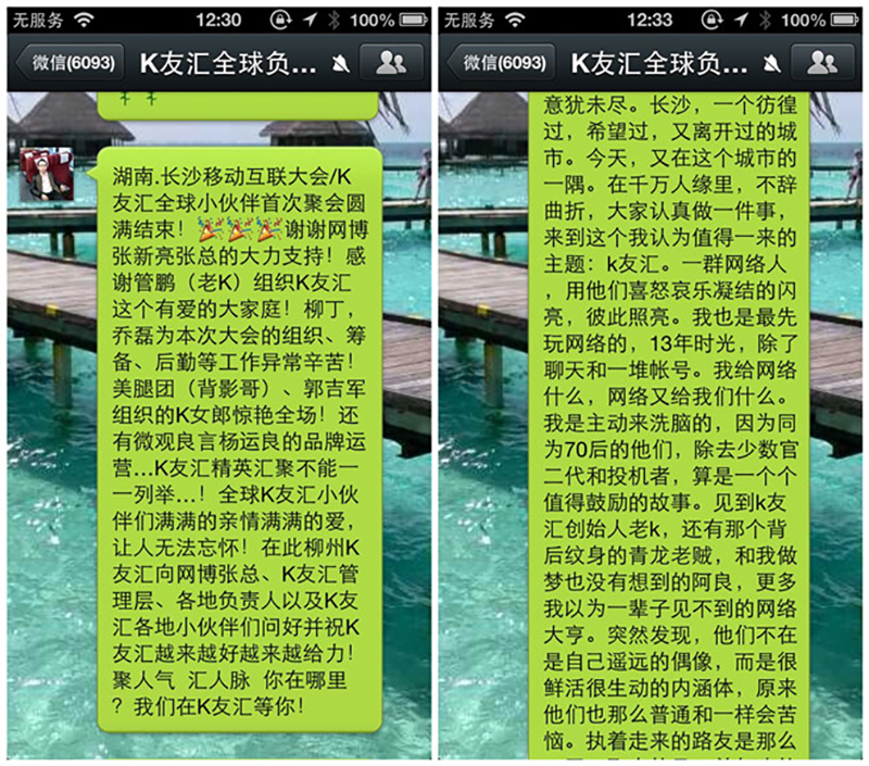 K友汇的发起人老K 管鹏先生首先就K友汇的由来给大家做了介绍,K友汇成立于9月3日,当时是老K的个人好友群,因为其本人有过万微信好友,希望可以把好友资源和更多的K友分享,所以创建了这个聚合人脉的平台。K友汇定位于打造社交平台上开放、分享、聚合、人脉的生态圈,目前已经创建有15个K友汇总群和一个已经过300人以上的微米大群。K友汇的品牌总顾问杨运良作为国内知名的品牌策划专家,把K友汇比喻成一棵苍天大树,每位K友就是树上面的一片叶子,树干就是全球各地的组织,树根就是各地的线下活动,福利就是树上面结的硕果。这种形象的比喻让大家倍感亲切,得到了在场各位的广泛的认可。杨运良还倡议发起了K友汇的品牌部门,增设马佳彬、志龙、灰太狼为品牌部的成员。K友汇目前在全球化的高速发展过程中,也已经不断的衍生多子品牌的成长,比如定位爱好微信、微博的美女K女郎,由美腿团出任团长。意向和腾讯公益深入合作积极落实参与各种公益活动的公益组织-K公益由魔王出任负责人。为了解决福利发放问题,正式推出专门发放特惠产品、赠送礼品的福利平台K友惠(微信号:kuh889)由iskyshop团队倾情打造。微盒之父、北京邮电大学3G学院董事长范金鹏先生还主动发起成立了聚合大学生人脉关系、扶持大学生创业的K学团,并在长沙的北邮3G学院湖南分院进行了首次的K学团成立大会,由杨天放出任秘书长。