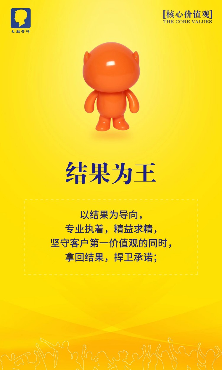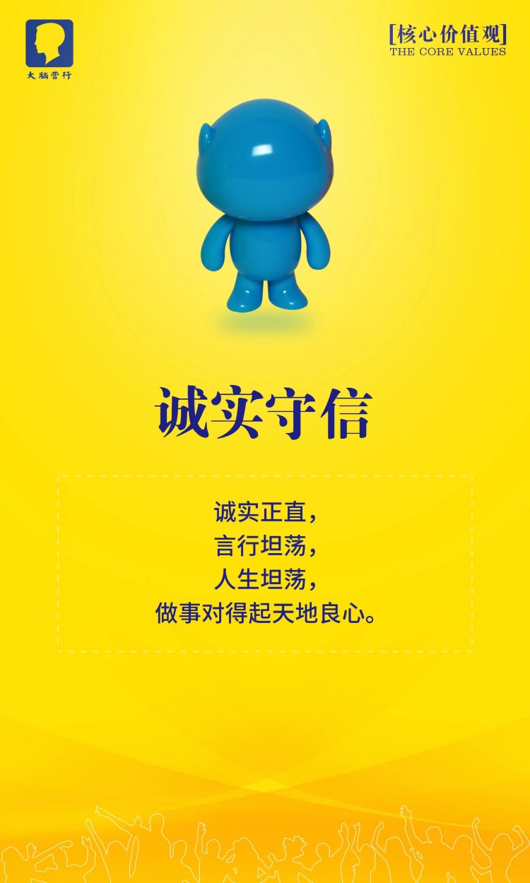 大脑营行的理想是用正正经经赚到的钱回馈员工,让大脑营行成为业内受人尊敬的公司。我们的理想是用正正经经赚到的钱做更多的研发,创造更好的产品,为客户提供更好的服务。一流的销售水平是我们赚钱的根本,一流的产品和服务是我们的命根。我们不会为了钱而不要命,因为我们有自己的灵魂:我们要实现客户,员工和公司的三赢。
