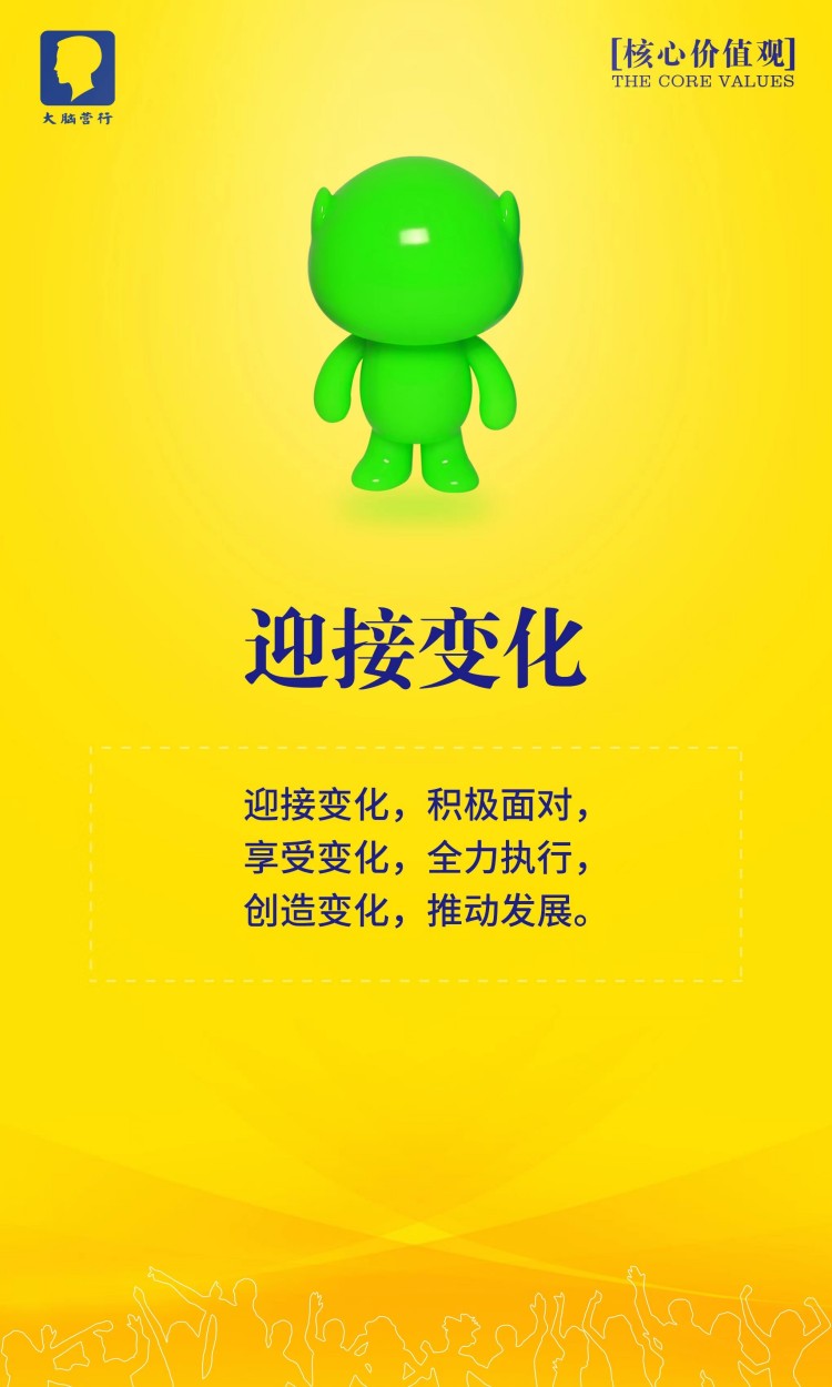 大脑营行以中小企业为目标客户,深入了解中小企业在经营管理和发展过程中面临的难题,帮助他们解决困难、满足需要、实现梦想,推出了《总裁商业思维》、《系统思维》等一系列实战落地的经营管理课程!大脑营行的员工真诚奉献,用生命捍卫誓言。