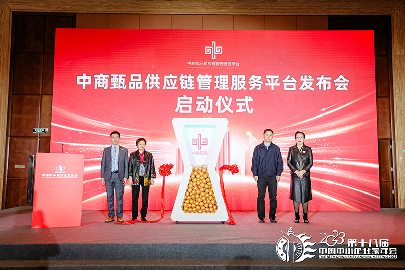 在数实融合与品牌发展论坛会议中,由中国中小商业企业协会副会长兼数字创新专业委员会主任王翌鑫、中国中小商业企业协会秘书长沈亚桂、北京首农大厨房供应链管理集团有限公司副总经理陈京星、董必武思想研究会董绍壬、中国中小商业企业协会数字创新专业委员会名誉主任董邓艾、中国礼仪休闲用品工业协会副秘书长张琳、老字号协同创新中心主任李恩羽、中国中小商业企业协会数字创新专业委员会副主任周芸妃共同启动了中商甄品供应链管理服务平台发布仪式。