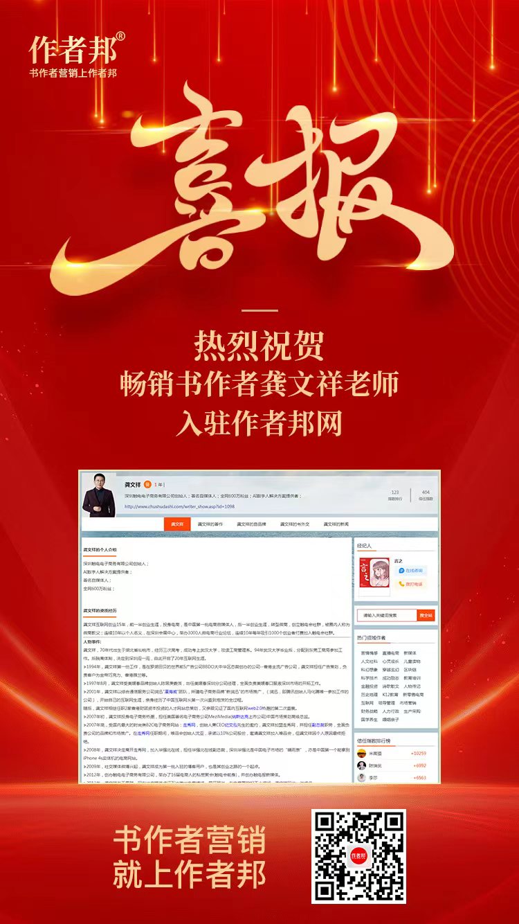 如今,龚文祥老师正式入驻作者邦网,既在信息汇聚呈现的平台上,向广大读者和客户提供了自己的作品、动态、理念以及智慧等,也在互联网的浪潮中,找到了更为便利和有效的智慧分享窗口。通过作者邦网,龚文祥老师既可以运用网络的力量,将自己的商业智慧和从业经验,以更为简易、通俗的方式,向大众进行普及。同时,更可以从平台上传播自己的思想和智慧理念,进而帮助更多的人实现梦想、迈步更好的未来。