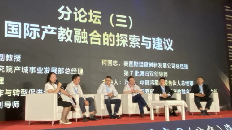 “国际产教融合的探索与建议”圆桌论坛由中创鸿星创投合伙人总经理、北京海归双创导师、国际产教融合专委会执行主任万松女士主持。参与发言的还有北京师范大学副教授郭垍老师、中关村产业研究院产城事业发展部总经理杨洋先生、智联有道总经理田荣华先生、