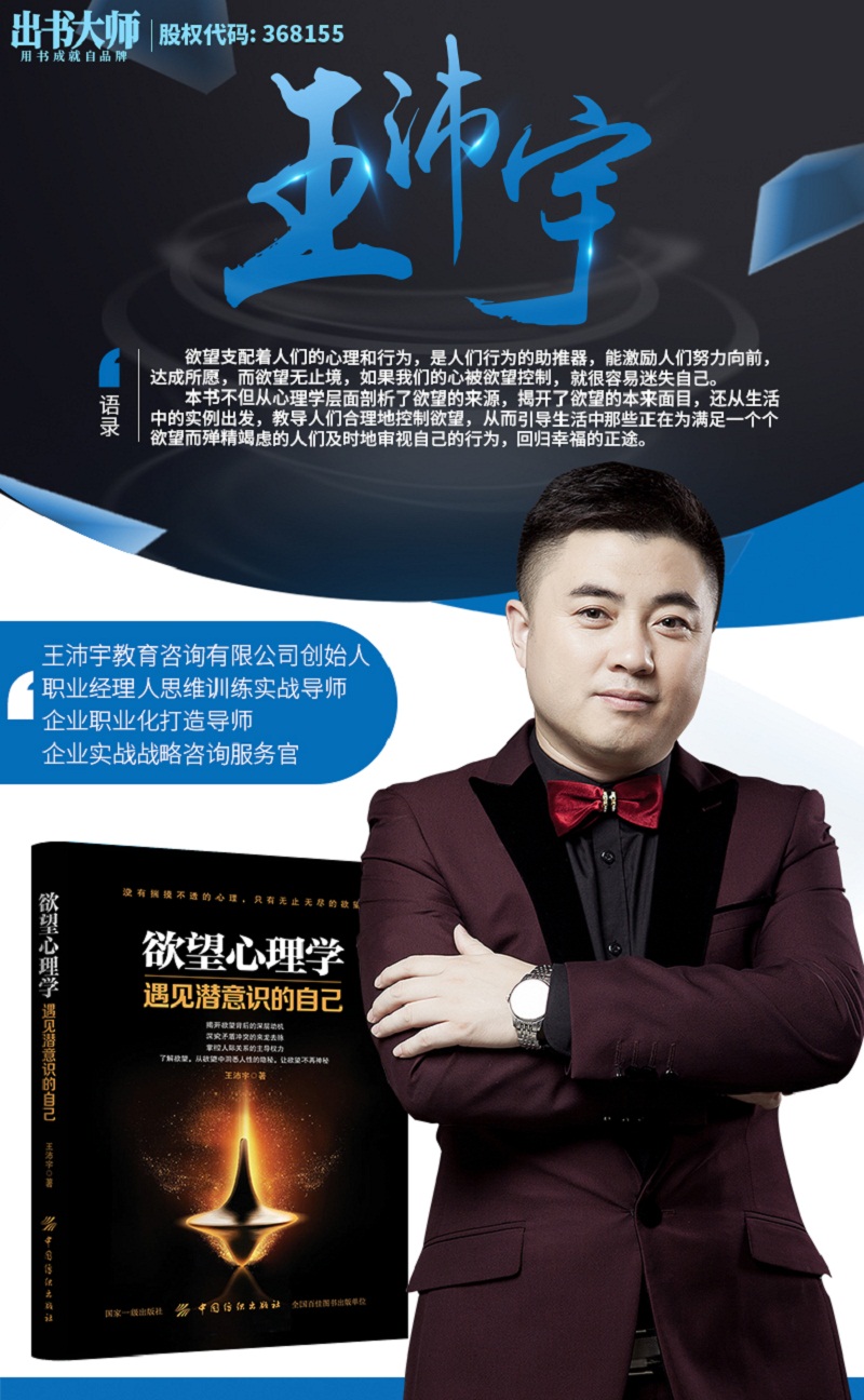 由出书大师精心策划出版,著名企业职业化打造导师王沛宇著作的《欲望心理学》自各大网上书城全渠道发售以来,销售火爆。在此书中王沛宇老师凭借着扎实的创业成功经验,丰厚的心理学专业知识直指欲望的本质。老师借“人为什么会有欲望?我们为什么要控制欲望?如何让欲望成为我们生产工作的前进动力?”这三个问题,深入浅出对欲望与心理学直接的关系进行了专业的剖析,一度获得读者粉丝的热烈追捧,争相购买这本书籍。