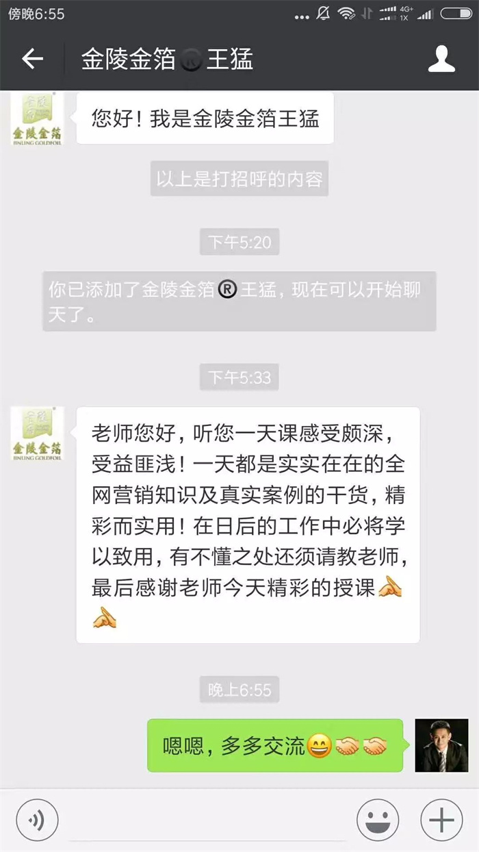 骏君老师的课结合了当前最前卫的人人互联、物物互联、业业互联的潮流大势,讲解了传统网络营销与微营销、全网覆盖、VR+AR,如何引爆互联网传播的道、法、术,2天时间,一气呵成,干货满满,非常实用!