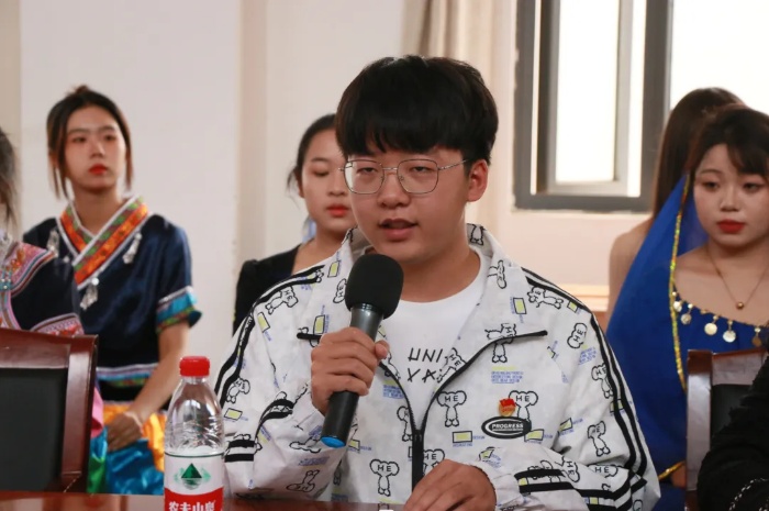董宇新同学用上千年来中华民族的发展史,强调了实现中华民族伟大复兴需要各民族手挽着手,肩并着肩,共同努力奋斗的重要性,呼吁同学们以铸牢中华民族共同体意识为主线,携手推动中华民族走向包容性更强、凝聚力更大的命运共同体,共建美好家园,共创美好未来,让民族团结进步之花长盛不衰。