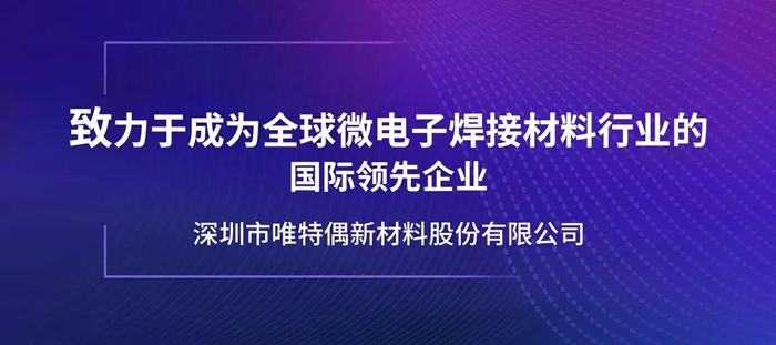 深圳市唯特偶新材料股份有限公司(股票代码:301319),成立于1998年,坐落于粤港澳大湾区核心引擎城市——深圳,是国内集电子焊接材料科研、开发、生产、销售、服务为一体的综合型集团公司;是国家第一批重点高新技术企业,并拥有广东省认定的工程中心;是微电子焊接材料行业第一家在创业板上市的企业。作为行业内的领先企业,公司拥有持续研发的技术创新能力,体现在产品配方开发能力、生产工艺控制能力、分析检测及产品应用检测能力等多个方面,逐步形成了行业领先的集产品配方研发、生产过程控制、质量检测于一体的技术体系。公司产品作为电子材料领域的重要基础材料之一,主要应用于PCBA制程、精密结构件连接、半导体封装等多个产业环节的电子器件的组装与互联,并最终广泛应用于通信、消费电子、智能家电、光伏、汽车电子、LED、医疗器械、安防等多个行业。公司与国内外众多客户建立了长期稳定的合作关系,积累了良好的市场声誉。公司主要客户包括华为、冠捷科技、中兴通讯、富士康、奥海科技、海尔集团、格力电器、联想集团、TCL、比亚迪、艾比森、强力巨彩、天合光能、晶科科技、TP-LINK(普联)、公牛集团、海康威视、大疆创新等国内知名企业或上市公司。