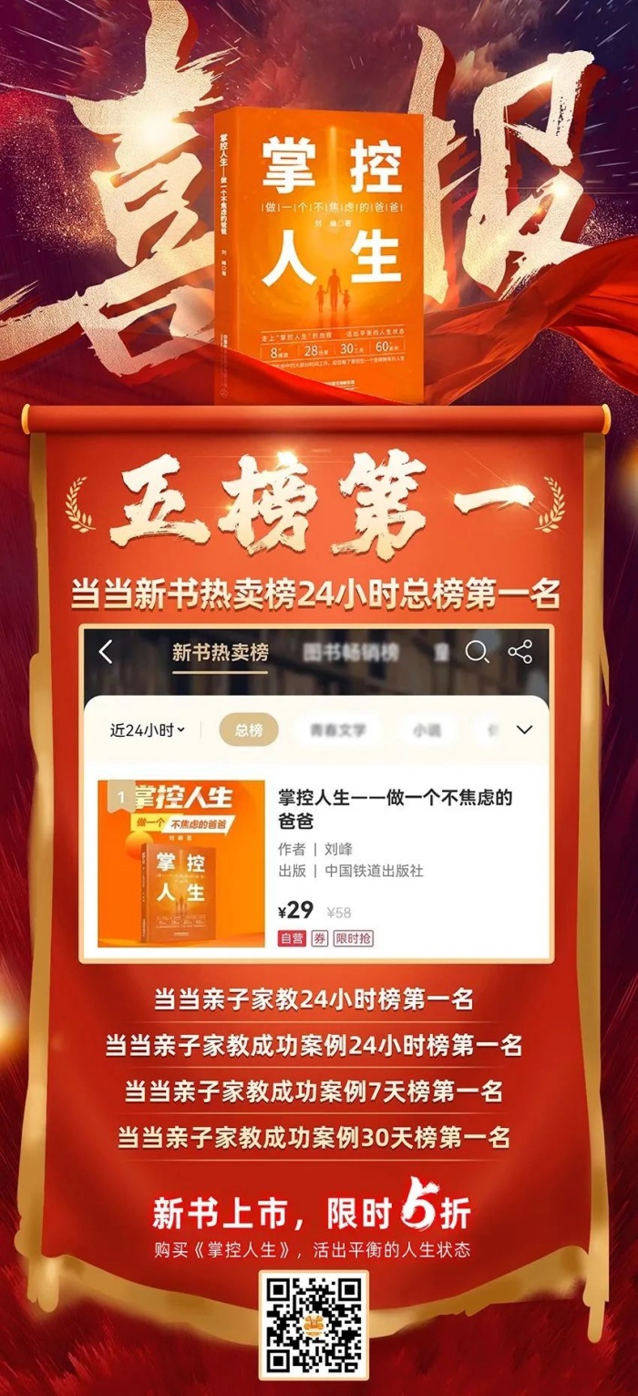 2023年11月8日,我的新书《掌控人生:做一个不焦虑的爸爸》正式在当当网上线开启销售。短短大半天时间,我们喜获了5榜第1的好成绩: