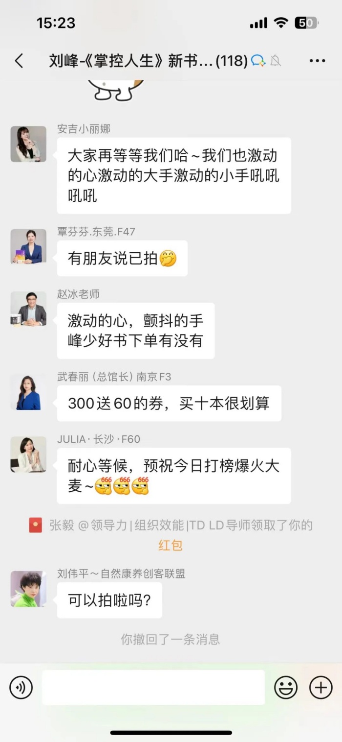 正当我在思考怎么办的时候,安吉又在我们峰盛的董事会群里给我留言,建议我给大家发个红包,就一本书的售价,表达一下对此刻下单的伙伴的感谢。这想法和我不谋而合,这是价格都没调整好,就愿意支持的伙伴,想都不用想,都是我身边最支持我的【真爱】,他们如此的爱与支持,我又怎么能不做出反馈了。