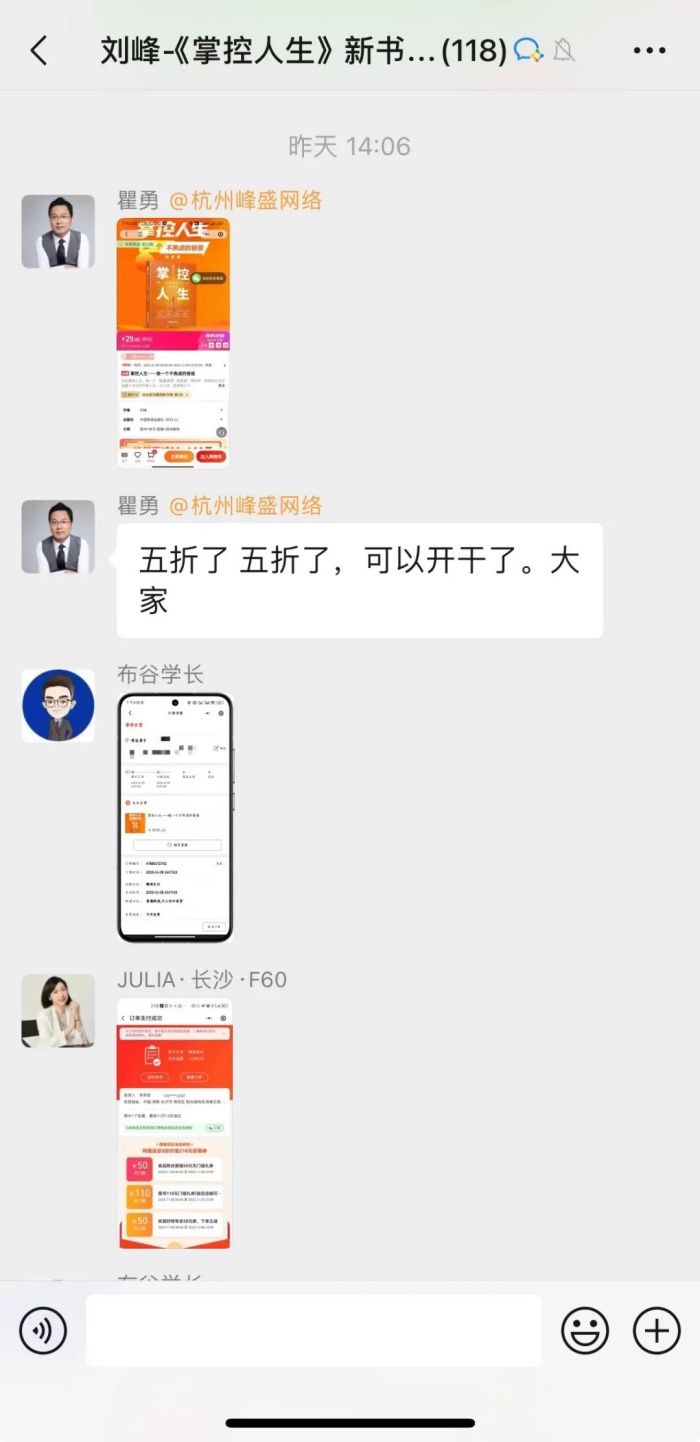 群里这么一发,还挺有效果,太太发完消息,就有伙伴不仅采购,还问我之前的三本合著是哪三本,说是也要凑齐。这瞬间又带动了其他基本图书的销售。我也在考虑,要不要来个套装组合呀,把我的三本合著+1本独著,不久的将来,还有我儿子的一本合著,打个包,配上我【刘峰的心意】盲盒,来个打包销售,或许也是不错的思路,哈。