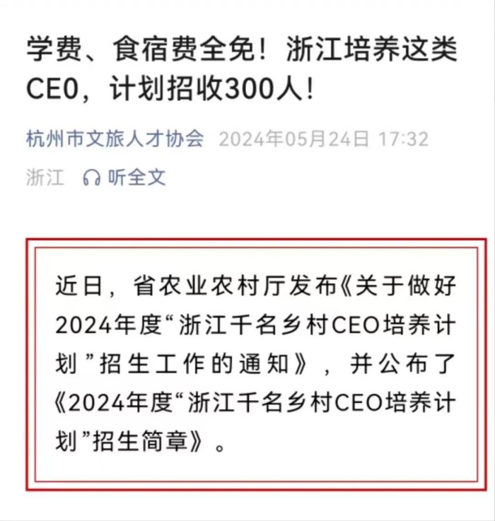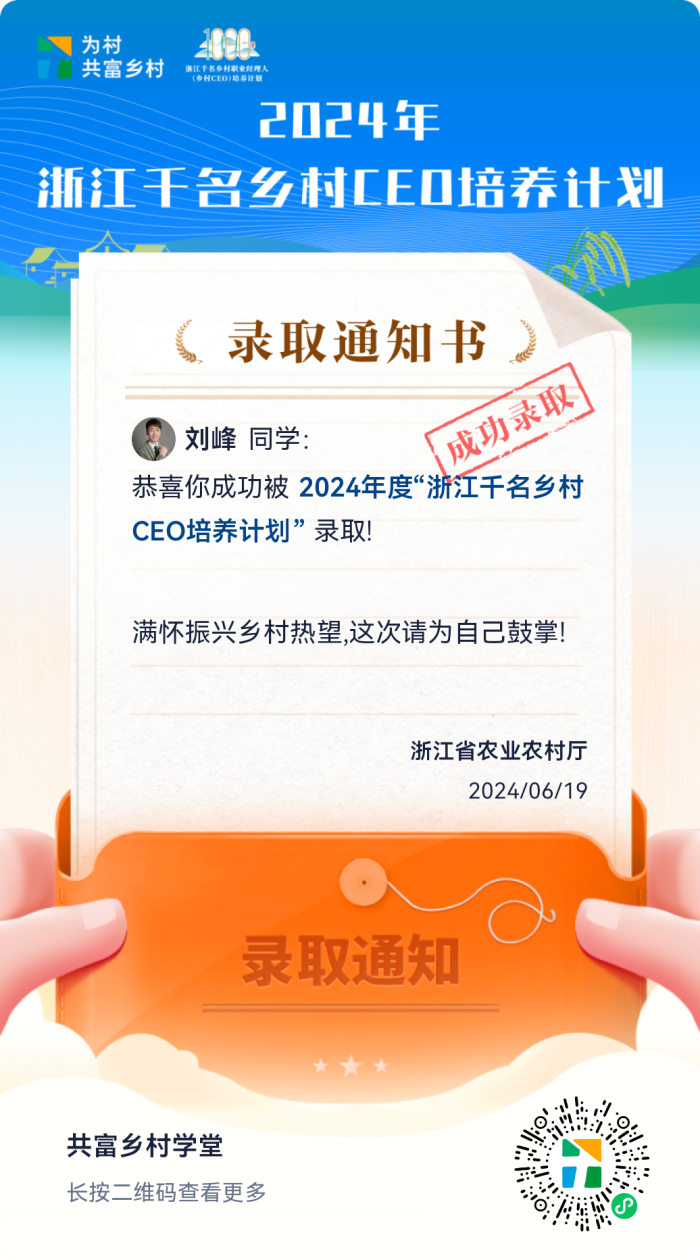 2024年5月24日,我在杭州市文旅人才协会的群里看到了浙江省农业厅发布的2024年度“浙江千名乡村CEO培养计划”的招生通知,如获至宝,第一时间提交了报名资料。