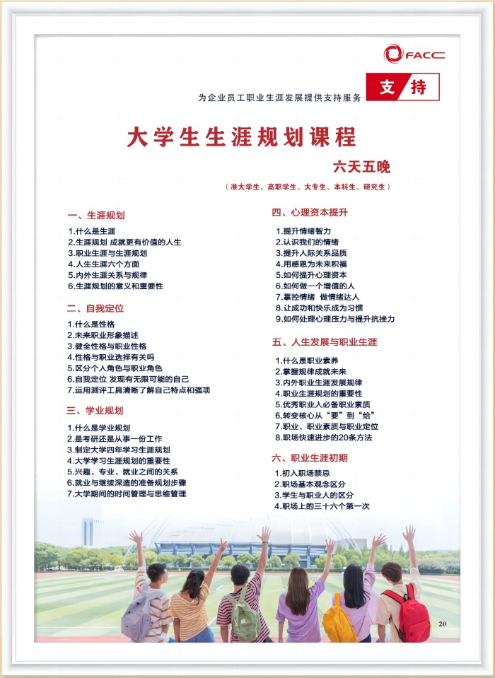 4.职场能力培养:讲解如何处理心理压力,培育强大的内心;提升情绪智力和抗挫力,以更好地应对职场中的挑战。教授如何提升人际关系品质,更好地融入职场团队。分享职场中的基本观念和容易踏入的职场雷区,帮助学生实现从学生到优秀职业人的转变。
