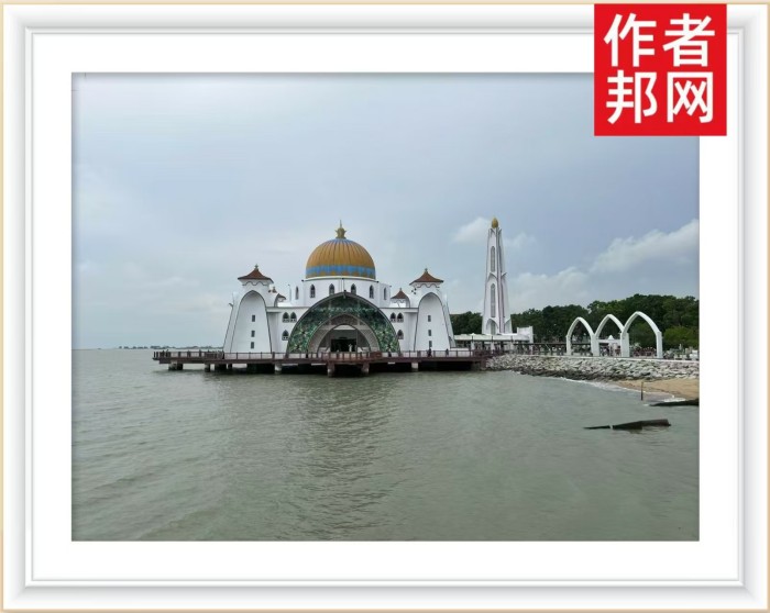 不远处,马六甲海峡清真寺(Melaka Straits Mosque)以其独特的建筑风格吸引了周老师的目光。这座清真寺建在人工岛上,其优雅的白色圆顶和尖塔在夕阳的映照下显得格外神圣和宁静。