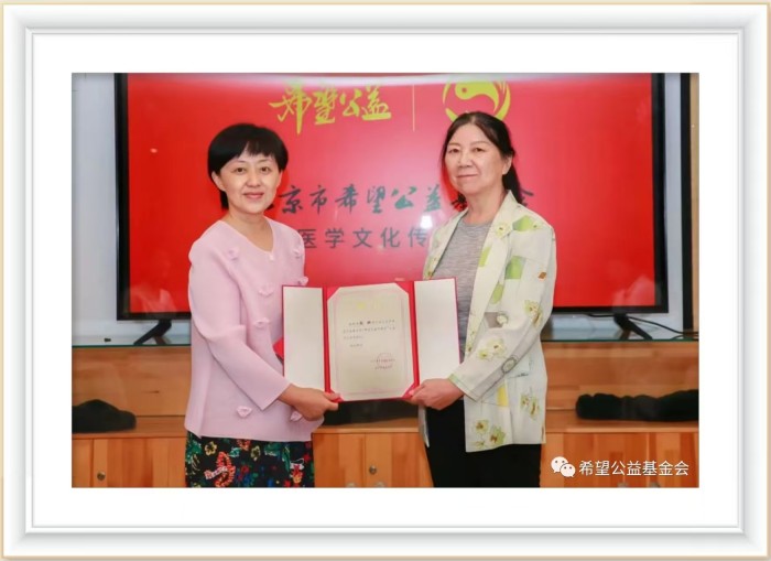 仪式期间由孙嫣理事长和王子木秘书长向北京市希望公益基金会中医学文化传承基金王楠主任、孔少梅副主任、基金会顾问张妍女士颁发了聘书及牌匾。