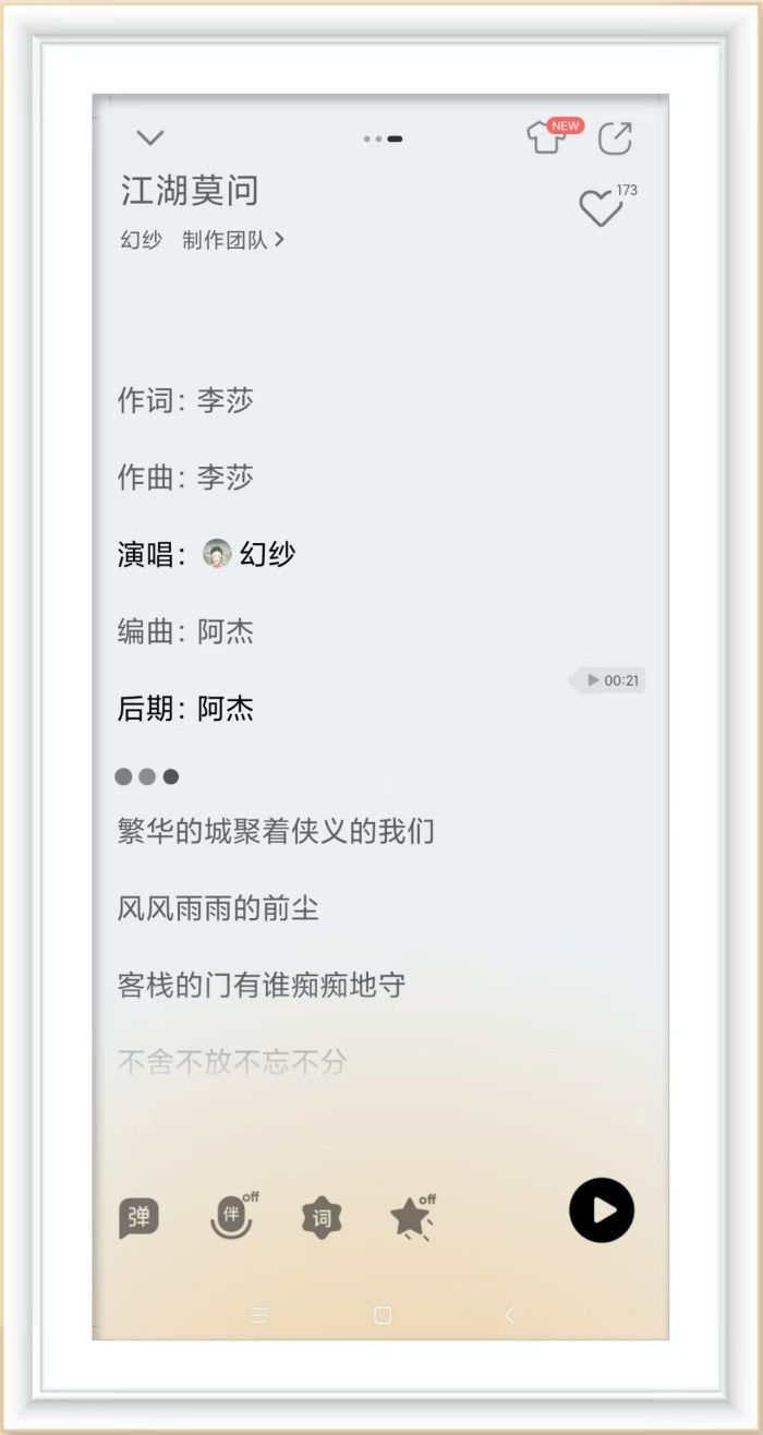 另一首主打歌《独影任风吟》则是李莎作词,李莎与Audrey共同作曲,幻纱用她极具感染力的嗓音将歌曲中孤独却又洒脱的江湖气质完美诠释。