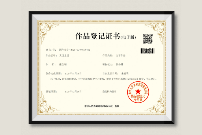 据悉,《无迷之迷》是张公辅先生近年来精心创作的一部力作。该作品以其独特的文学视角和深刻的思想内涵,赢得了广泛的关注和赞誉。此次成功获得版权登记证书,不仅是对张公辅先生创作成果的肯定,也是对其文学才华和创作精神的认可。