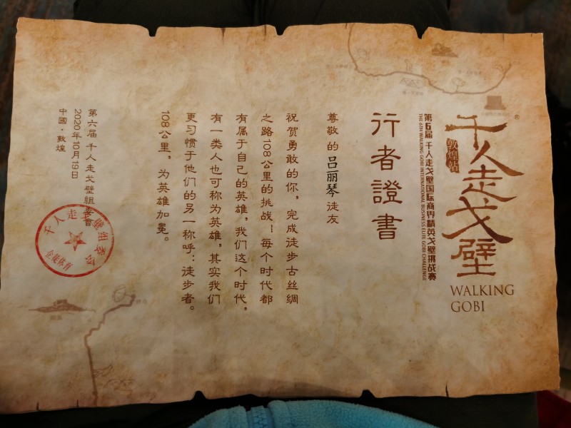 四季莱源团队用4天的时间完成了108公里的戈壁挑战,团队成员全部完赛,获得“沙克尔顿奖”的团队荣誉和千人走戈壁“行者证书”的个人最高荣誉奖。而这一次的胜利,离不开每一位成员的付出与协作。在吕丽琴女士的带领下,团队成员相互扶持,共同克服了重重困难!