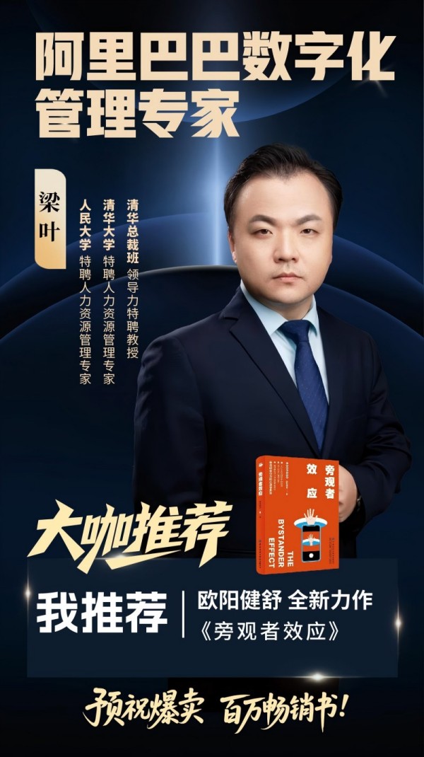 近日,心理学应用研究学者、传统文化教育与传播专家欧阳健舒老师的新书《旁观者效应》即将上市。更令人瞩目的是,本书获得了阿里巴巴数字化管理专家、清华总裁班特聘教授梁叶的鼎力推荐。作为人力资源管理领域的权威,梁叶教授从组织行为学的角度,为本书赋予了更深层次的管理学价值。