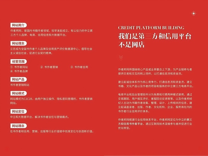 作者邦网是国内较早成立的书作者信用与营销平台,定位为“中立第三方”,通过互联网技术整合出版、营销、信用管理等服务,为书作者提供一站式解决方案。