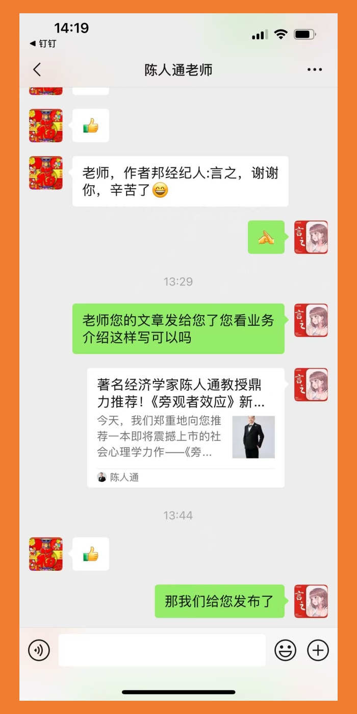 经过作者邦团队的高效协作,陈人通的个人微信公众号成功通过审核,正式上线。当团队将注册成功的截图发给陈人通时,他在百忙之中回复道:“非常感谢你们的专业和负责,原本以为会很复杂的事情,被你们处理得这么顺利。”