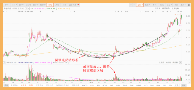 如果说超跌底是“疾风骤雨后的彩虹”,那么熊市圆弧底则是“冰雪消融时的涓涓细流”。何青平描述道,在漫长的熊市中,市场人气涣散,成交量持续低迷。此时,个股和市场的底部通常会以圆弧形态悄然出现。