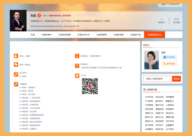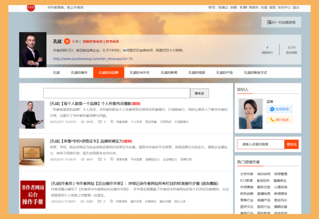 作者邦网为每位入驻的书作者提供一个专属的个人网站,这不仅是信息保存的工具,更是强大的营销获客平台。该网站包含八大核心栏目:作者介绍、著作展示、自品牌建设、书外交活动、新闻动态、视频内容、产品销售和联系方式。这些栏目覆盖了书作者所需的全部信息类型,确保全面展示作者的创作生涯和个人品牌。例如,作者可以通过“著作栏目”详细列出所有作品,并附带购买链接;通过“新闻栏目”发布最新动态,吸引媒体关注。网站还支持多媒体内容,如视频和图片,让展示更生动。更重要的是,这个网站作为流量中枢,能有效整合内外资源,帮助作者扩大影响力。通过这种集中展示,书作者可以避免信息碎片化,提升专业形象,同时方便读者和合作伙伴快速获取所需信息。