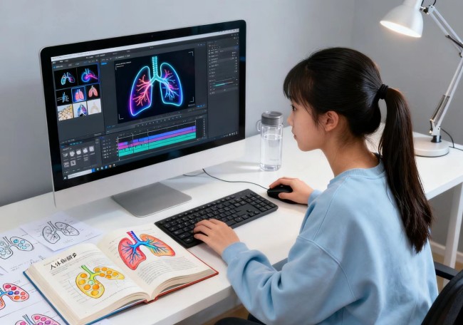 她开始系统地整理自己的关于肺呼吸的相关素材,合理的运用AI软件技术剪辑、呈现。她要将复杂的知识,变成孩子们能看懂的漫画,成人们能快速上手的图表。