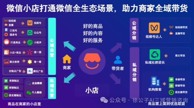 有人就说了,这不就是之前的小程序商城的分销吗? 对又不对,类似差不多都是把消费者变成消费商,达到自用省钱,分享赚钱的社交电商分销模式,但是这个分销只能是纯私域进行推广,微信小店推客最大的区别就是打通了公私域联动,以公域导流私域,私域反哺公域,通俗来讲就是推客把私域的人引导公域视频号直播间,那么用户在直播间下单,就会跟推客产生关系,而且视频号还会1:1推流到直播间,这样大大降低了直播成本,试想一下一个品牌方能发展一万推客去分享的时候,哪怕每个平均只拉10人,那么品牌方直播间的人气10万,而且还有公域流量扶持,是不是直播瞬间就冷启动。