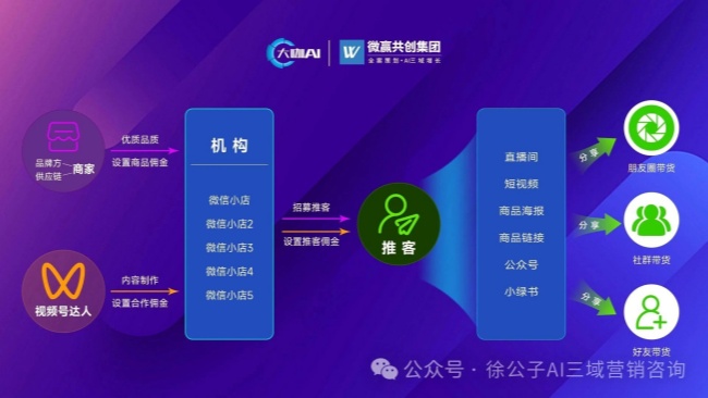 AI三域营销:打通公私域的“任督二脉”公域曝光:AI数字人矩阵批量生产短视频/直播内容,30秒生成口播文案,24小时无间断触达用户;私域裂变:通过私域SOP+裂变工具+智能体,激活私域,裂变推客;(这众所周知 微赢共创在5G私域流量核裂变系统打法上,已经帮助几百个品牌,拿到4000多万私域流量裂变的结果。)店域升单:借助AI三域新店商数字化体系和千城万店模型,打通线上线下,提升门店业绩,下门店通过推客获客成本降低60%。同时通过私董会,沙龙会,招商会、培招会等 把推客变代理商。