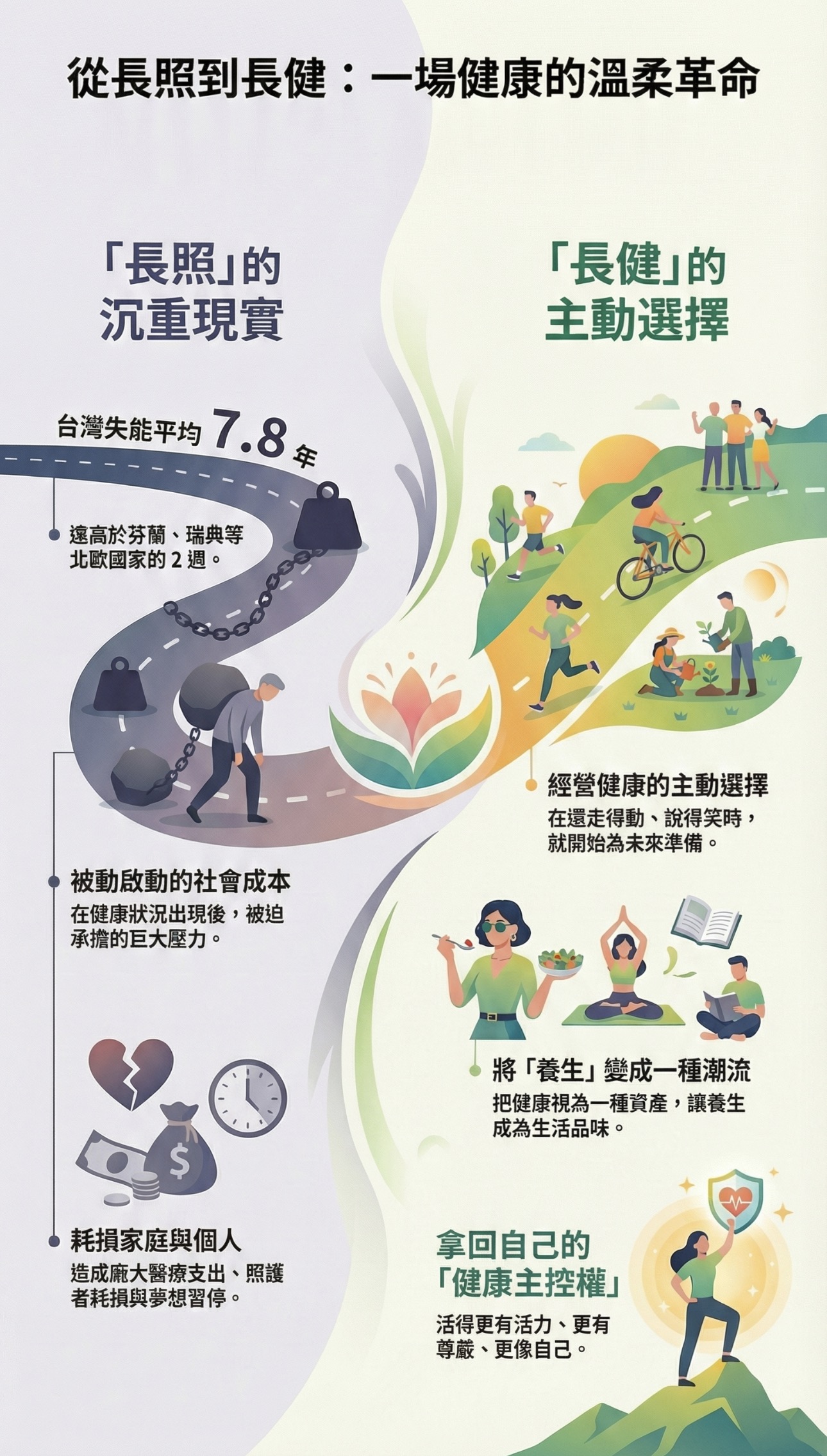这一差距,本质上是一种文明形态的警示。它揭示了我们将健康仅仅视为“医疗问题”,而非“生存状态”的根本局限。当社会系统主要围绕着“病后治疗”与“失能照护”构建时,无论投入多少资源,都像是在下游拼命打捞落水者,却无人去上游修筑护栏。沉重的长照负担,正日益成为家庭的情感黑洞与国家财政的结构性压力,侵蚀着社会发展的活力与代际间的公平。因此,变革的起点,必须从重构我们对健康的核心认知开始。