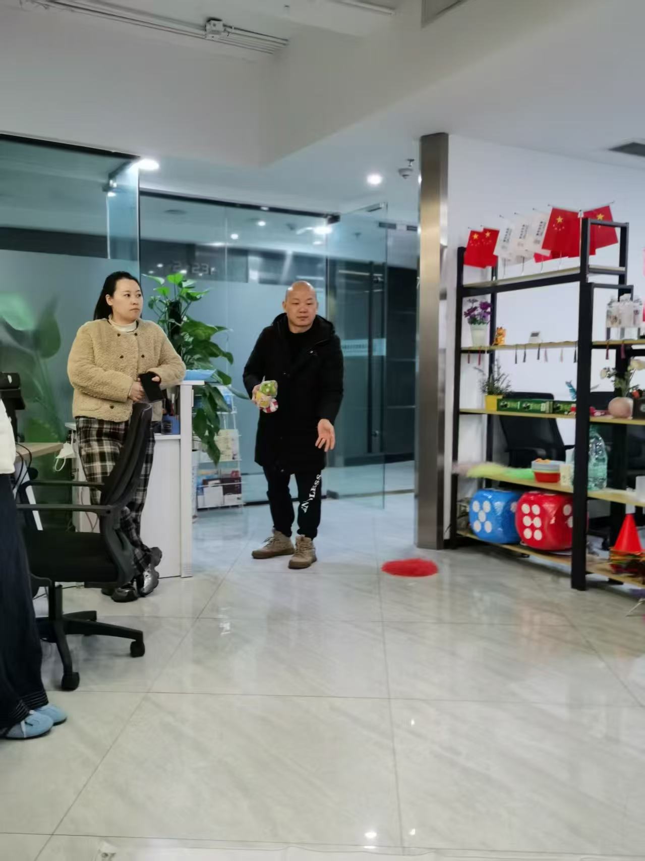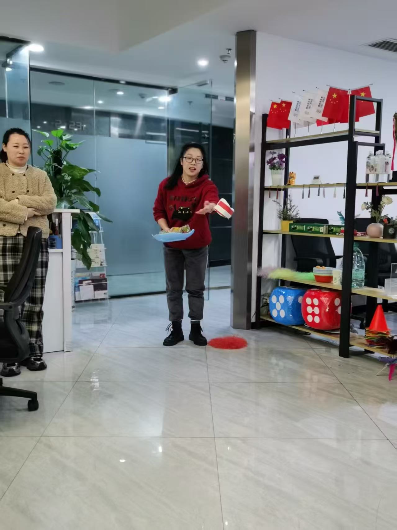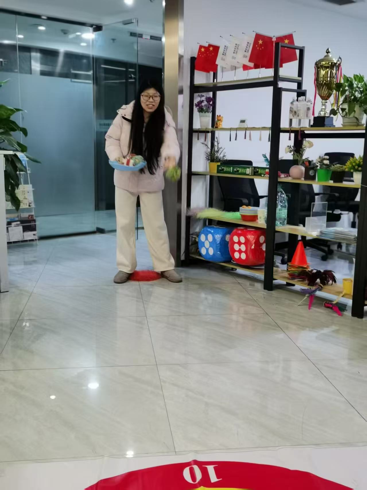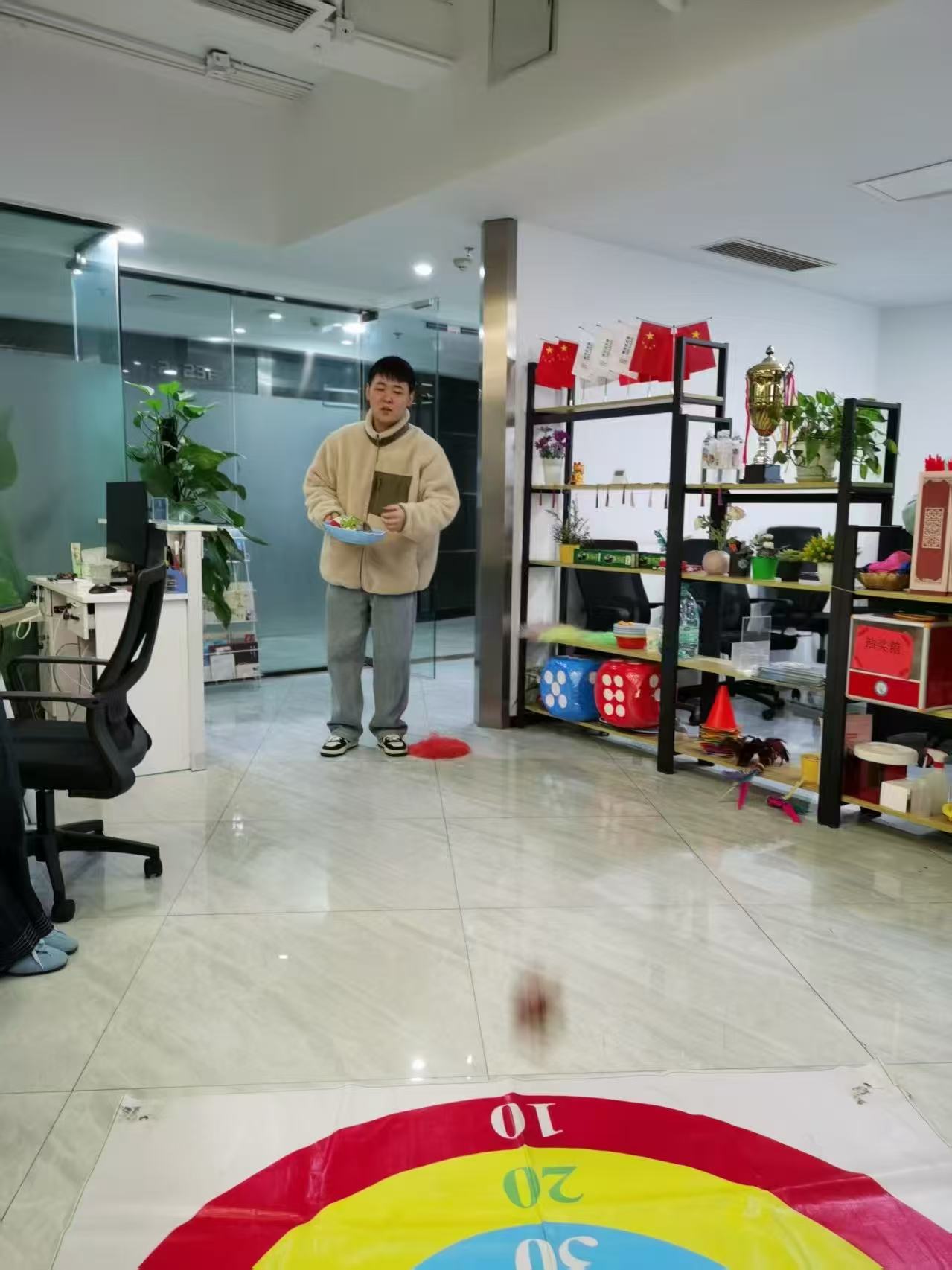平日里堆满文件的桌子被腾开,有人蹲在地上整理投掷道具,嘴角藏着笑意;有人靠在椅背上刷活动预告,和同事小声打趣;抱着礼品托盘的姑娘来回走动,托盘上的小礼品碰撞出声。玻璃隔断后的会议室还亮着灯,但此刻的办公区,已成了没有层级、没有压力的天地——紧绷的肩膀放松,严肃的神情被笑容取代,原来职场卸下铠甲后,藏着这么多模样。